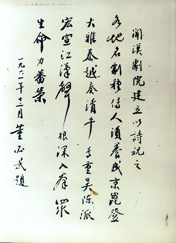 武漢漢劇院是全國有較大影響的藝術(shù)團(tuán)體,其前身為武漢漢劇團(tuán)。一九六二年在周恩來總理的關(guān)懷下,正式建院,國家副主席董必武贈詩:“京昆登大雅、秦越奏清平,尊重吳陳派,宏宣江漢聲,根深如群眾,生命力蕃榮”以示祝賀。